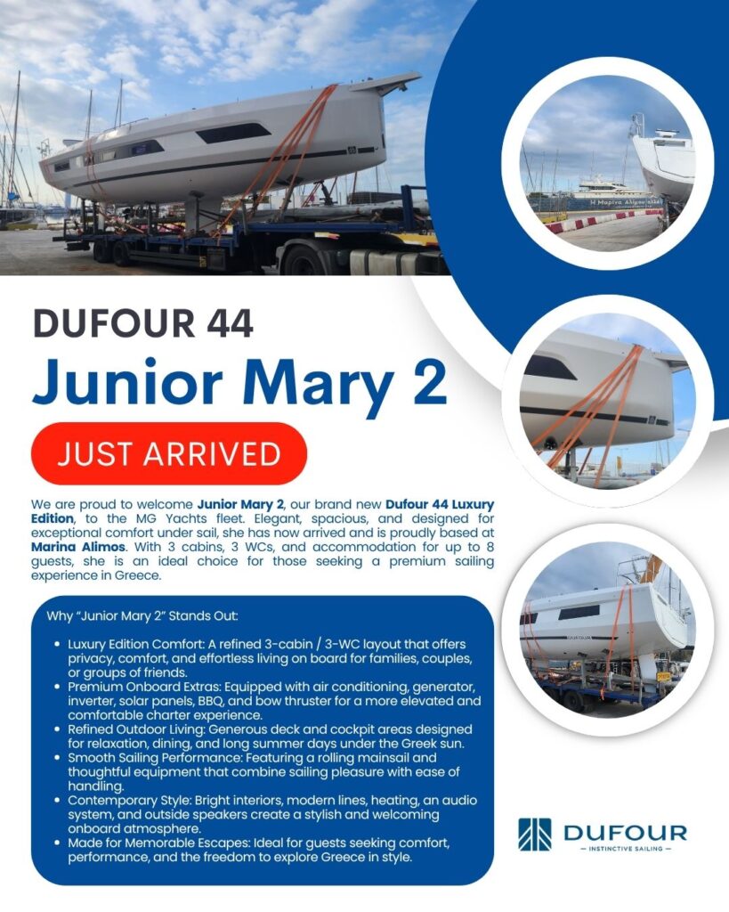 We are proud to welcome Junior Mary 2, our brand new Dufour 44, to the MG Yachts fleet. Elegant, spacious, and designed for exceptional comfort under sail, she has now arrived and is proudly based at Marina Alimos.