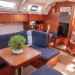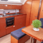 Boat equipment features a rolling mainsail, solar panels, a bimini and a bow thruster. It also boasts an audio system, outside speakers and inside speakers. The fully-equipped galley includes a fridge, an oven, a cooker, a sink and kitchen utensils.