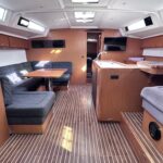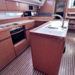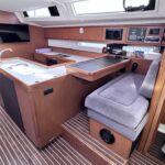 Boat equipment features a rolling mainsail, a bimini and a bow thruster. It also boasts heating, air conditioning, an audio system, outside speakers and inside speakers. The fully-equipped galley includes a fridge, an oven, a cooker, a sink and kitchen utensils.