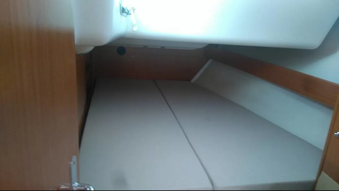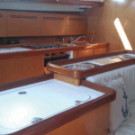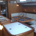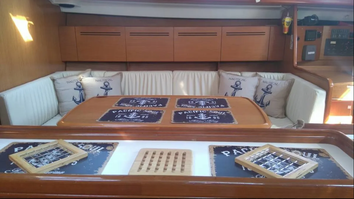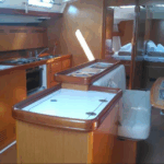 Boat equipment features a rolling mainsail, a generator, a salon GPS plotter, a bimini and a bow thruster. It also boasts heating, air conditioning, an audio system, outside speakers and inside speakers. The fully-equipped galley includes a fridge, an oven, a cooker, a sink and kitchen utensils.