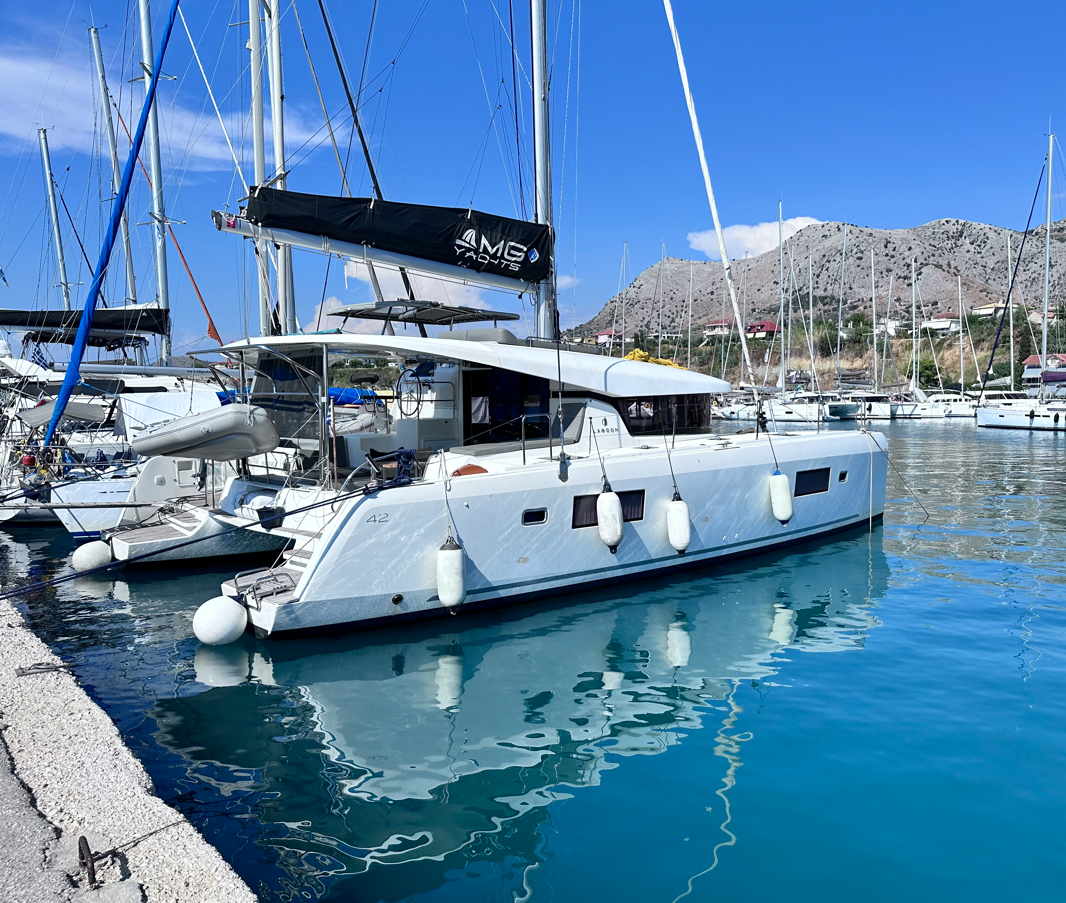 6-cabin catamaran Lagoon 42 – MG-LAG42-20-S was built in 2020 and it is docked in Marina Palairos, Greece.