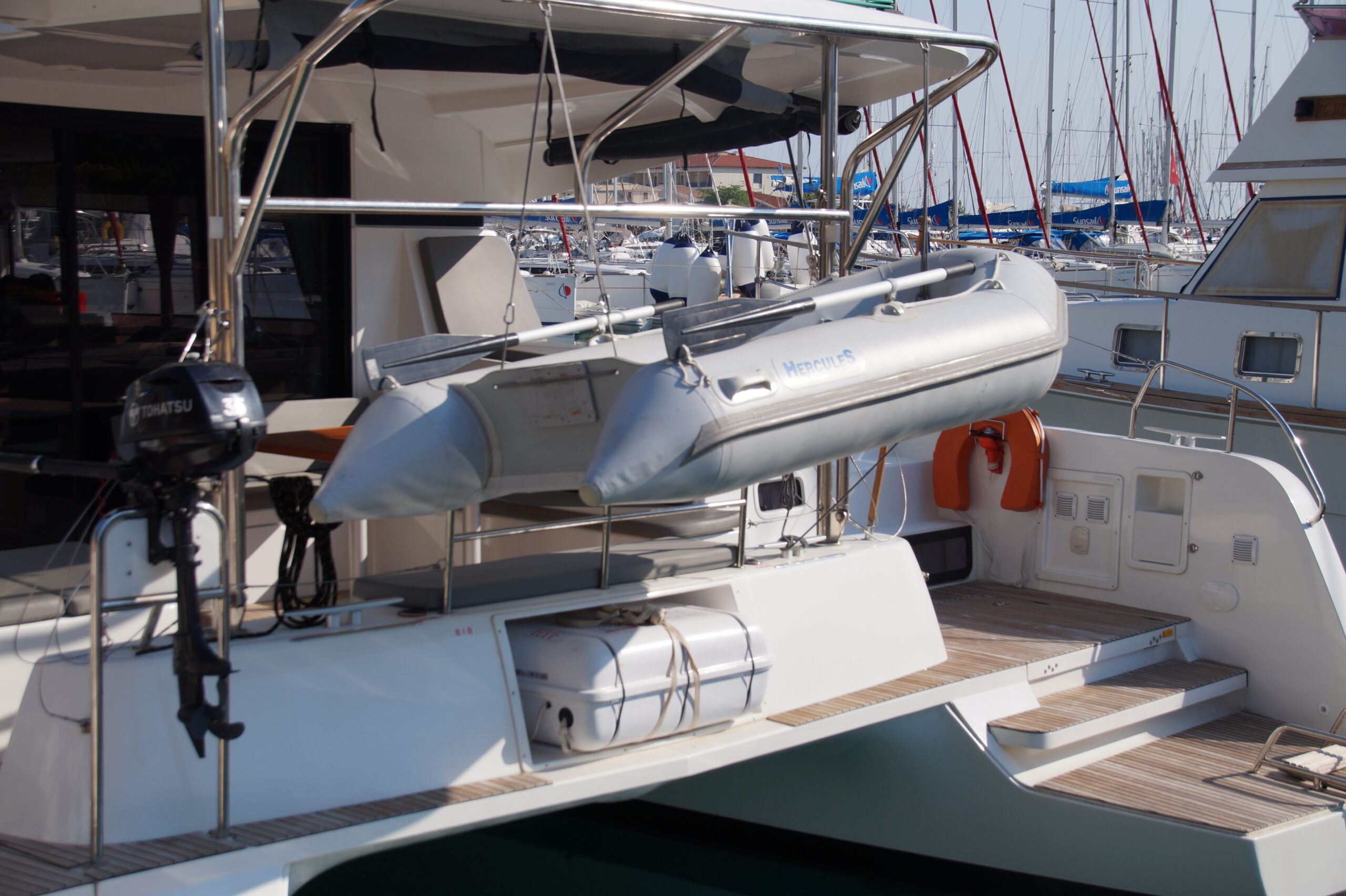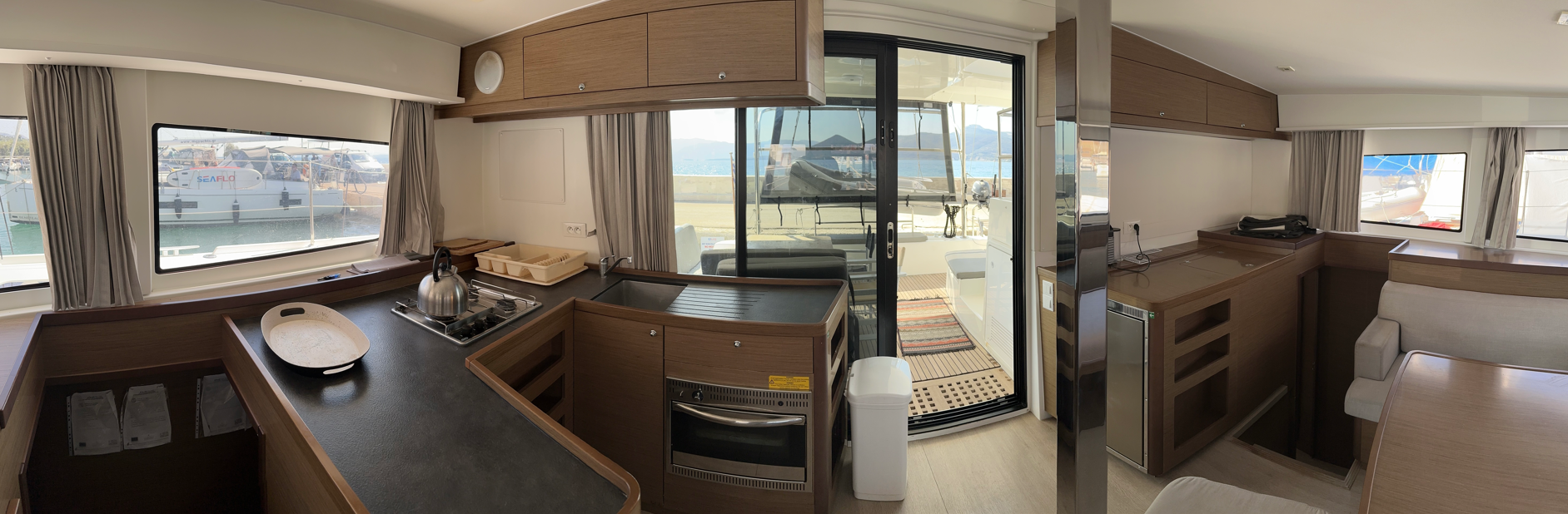 Boat equipment features a classic mainsail, solar panels, a generator, a bimini and an outside GPS plotter. It also boasts heating, air conditioning, an audio system, outside speakers and inside speakers. The fully-equipped galley includes a freezer, a coffee machine, a fridge, an oven and a cooker.