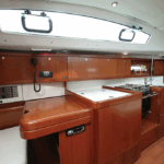 Boat equipment features a classic mainsail, solar panels, a bimini and a bow thruster. It also boasts an audio system, outside speakers and inside speakers. The fully-equipped galley includes a fridge, an oven, a cooker, a sink and kitchen utensils.