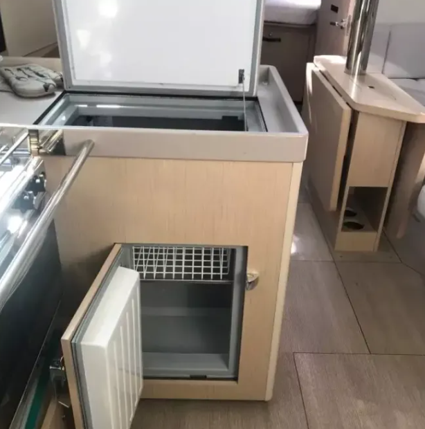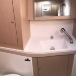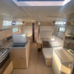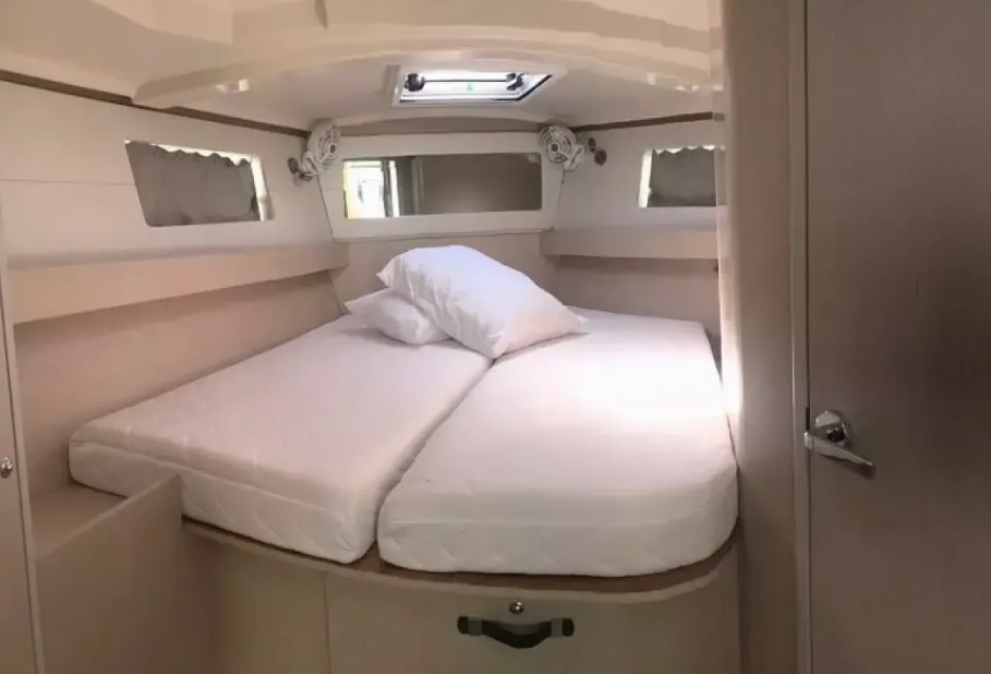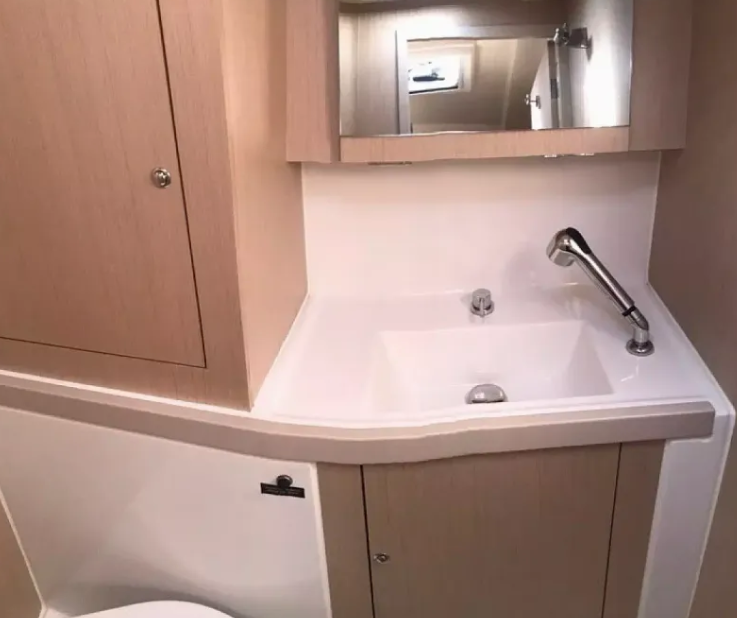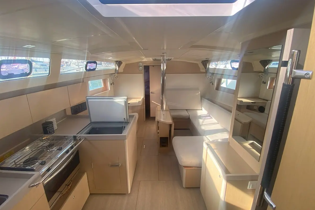 Boat equipment features a rolling mainsail, solar panels, a bimini and a bow thruster. It also boasts an audio system and outside speakers. The fully-equipped galley includes a fridge, an oven, a cooker, a sink and kitchen utensils.