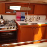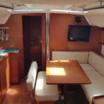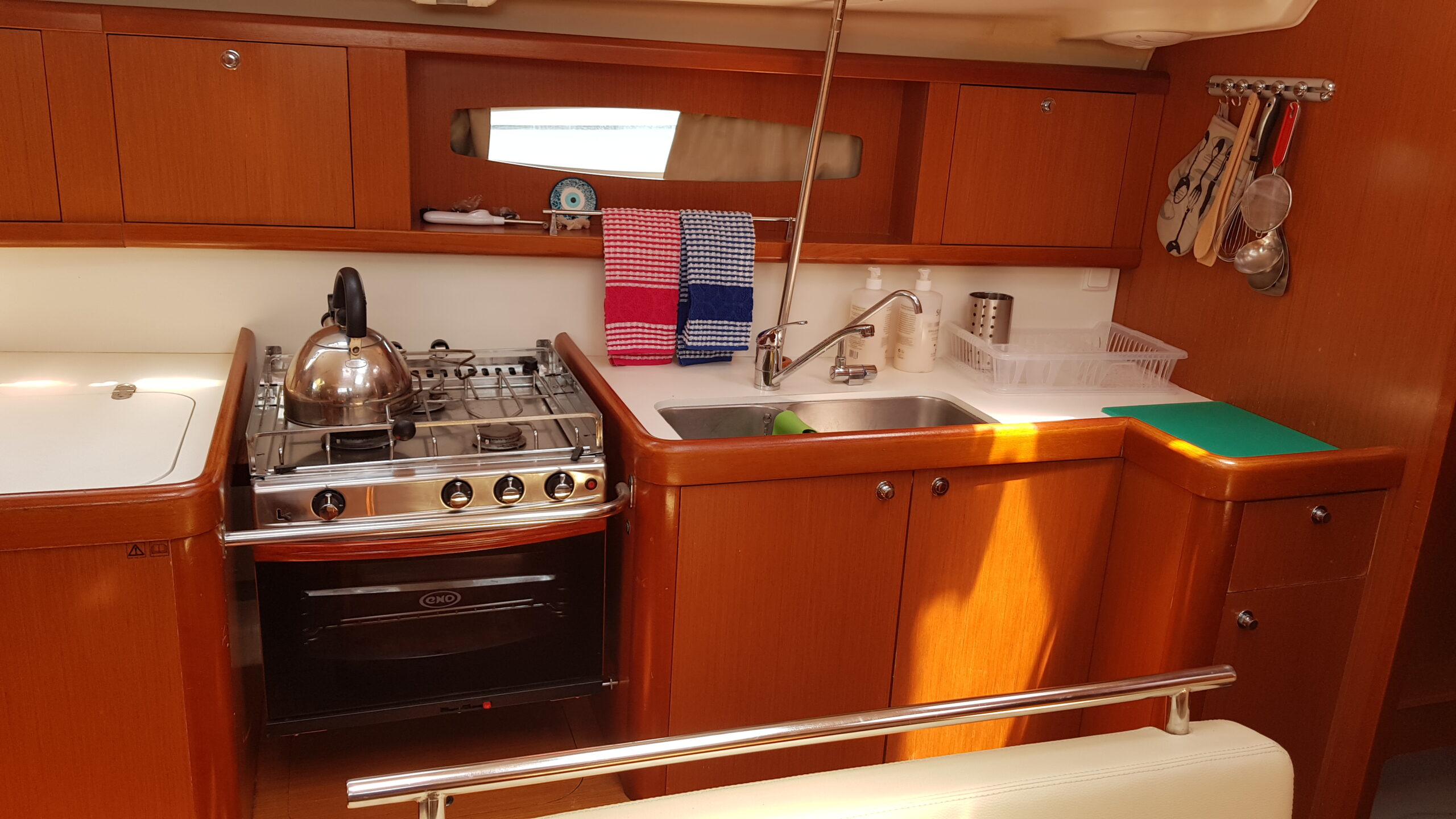 Boat equipment features a classic mainsail, electric winches, solar panels, a salon GPS plotter, a bimini and a bow thruster. It also boasts an audio system, outside speakers and inside speakers. The fully-equipped galley includes a fridge, an oven, a cooker, a sink and kitchen utensils.