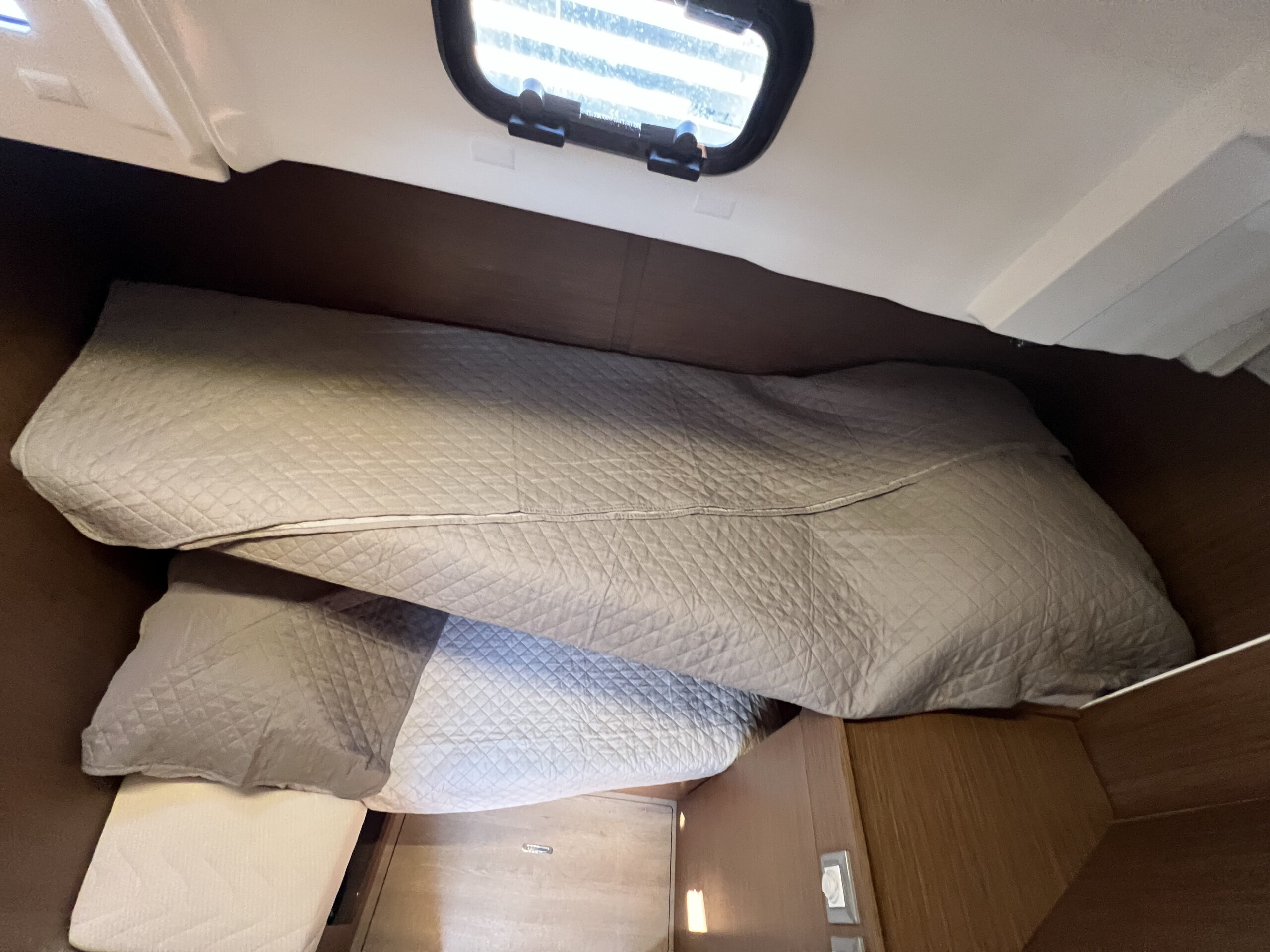 Boat equipment features a rolling mainsail, electric winches, solar panels, a radar, a salon GPS plotter and a bimini. It also boasts an audio system, outside speakers and inside speakers. The fully-equipped galley includes an ice maker, a freezer, a coffee machine, a fridge and an oven.