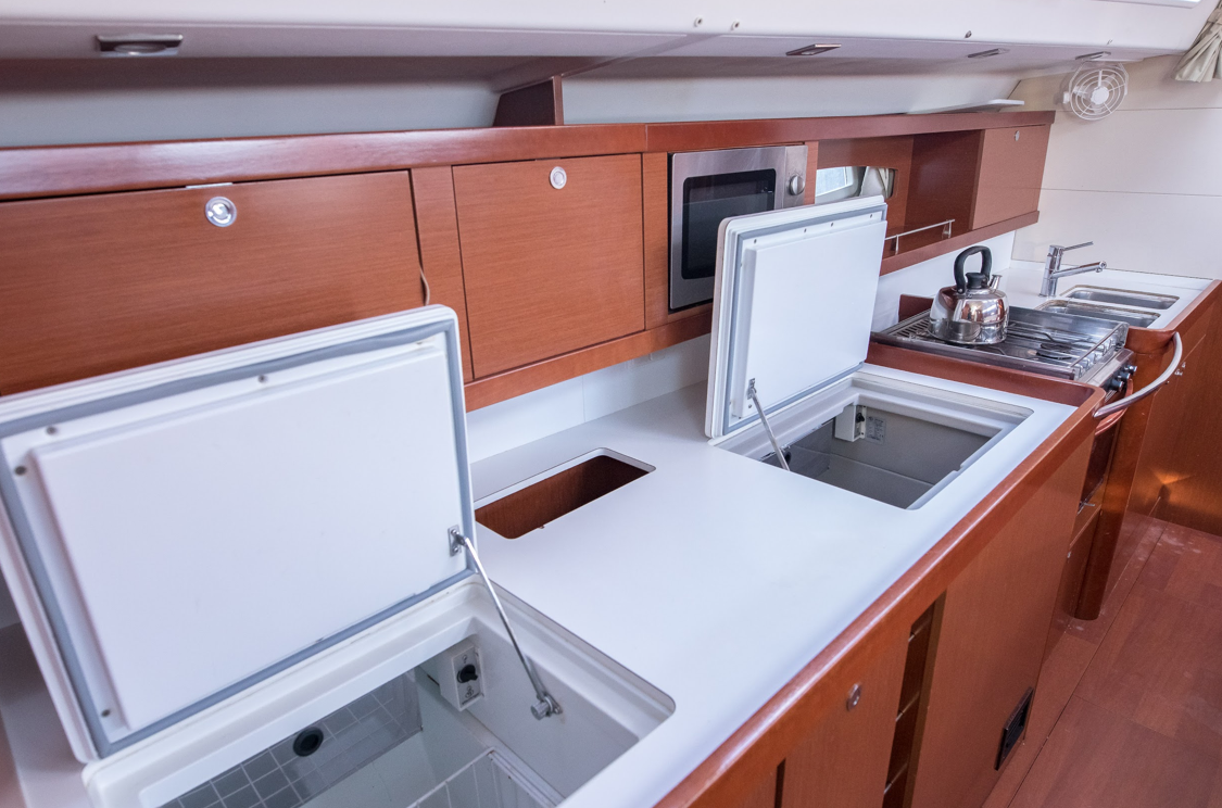 Boat equipment features a full batten mainsail, a generator, a bimini and a bow thruster. It also boasts a flat screen TV, heating, air conditioning, an audio system and outside speakers. The fully-equipped galley includes a fridge, an oven, a cooker, a sink and kitchen utensils.